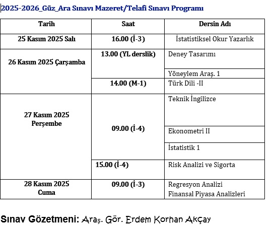 Zaman Serileri Analiz dersi telafi sınavı 04 Haziran 2025 Çarşamba günü 10.30 da yapılacak